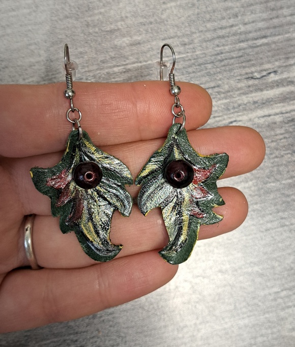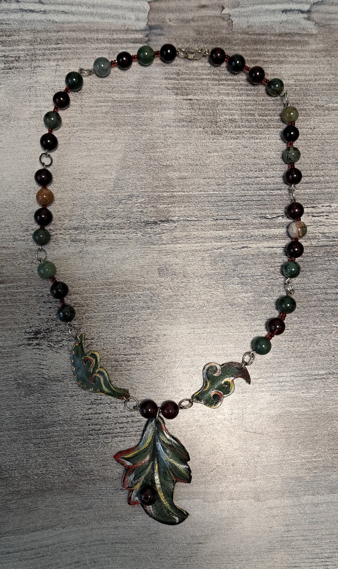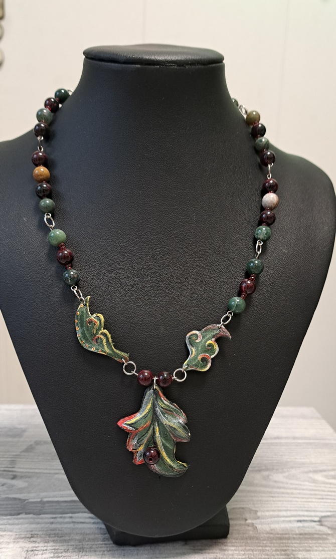 яшма, пластмассовые бусины (бордовые), натуральная кожа, краски по коже.