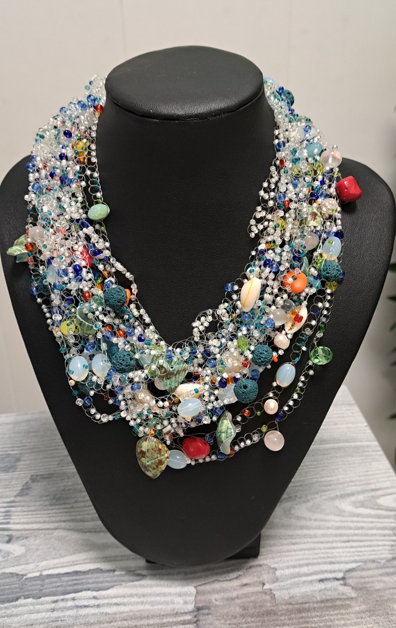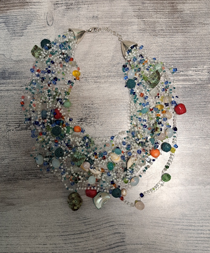 раковины, лунный камень, кораллы, бисер, пластмассовые бусины с эффектом кракелюра, леска.